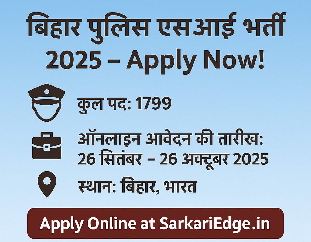 BPSSC द्वारा 1799 सब-इंस्पेक्टर (SI) पदों के लिए ऑनलाइन आवेदन शुरू बिहार पुलिस अवर सेवा आयोग (BPSSC) ने 2025 के लिए सब-इंस्पेक्टर (SI) पदों की भर्ती के लिए आधिकारिक अधिसूचना जारी की है। इस भर्ती के तहत कुल 1799 पदों पर नियुक्तियां की जाएंगी। आवेदन प्रक्रिया 26 सितंबर 2025 से शुरू होकर 26 अक्टूबर 2025 तक चलेगी। कुल पदों की संख्या: 1799 चयन प्रक्रिया में निम्नलिखित चरण शामिल हैं: ऑनलाइन आवेदन के लिए निम्नलिखित चरणों का पालन करें: महत्वपूर्ण तिथियाँ: लिखित परीक्षा में दो मुख्य भाग होंगे: नोट: नकारात्मक अंकन प्रणाली लागू नहीं है। महत्वपूर्ण: शारीरिक मानक परीक्षा केवल PET के दौरान आयोजित की जाएगी। बिहार पुलिस में सब-इंस्पेक्टर (SI) के रूप में चयनित उम्मीदवारों को सरकार द्वारा निर्धारित वेतन और भत्ते मिलते हैं। वेतनमान राज्य सरकार के नियमों के अनुसार होता है और इसमें बेसिक पे, एचआरए (HRA), डीए (DA), और अन्य भत्ते शामिल होते हैं। अधिक जानकारी और सहायता के लिए निम्नलिखित संपर्क विवरण का उपयोग करें:बिहार पुलिस एसआई भर्ती 2025