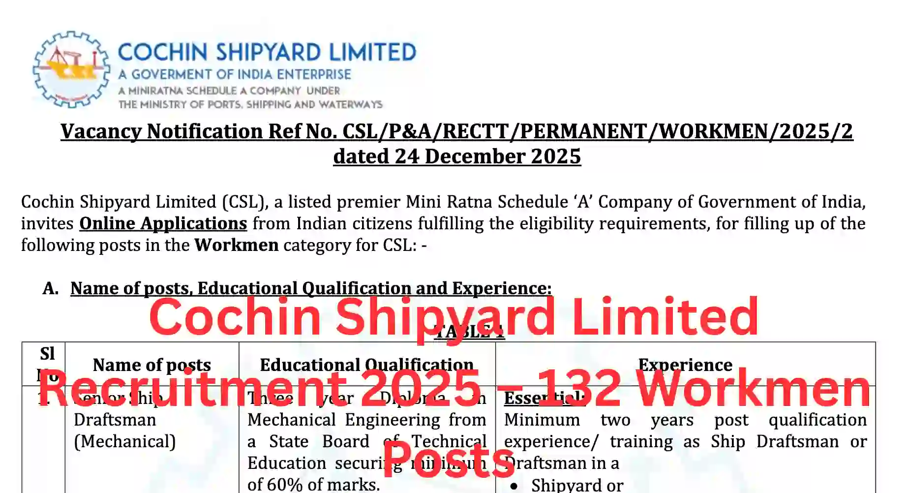 Short Information: Cochin Shipyard Limited (CSL), a Government of India Mini Ratna Company, has released an official notification for recruitment of 132 Workmen category posts. Eligible Indian citizens can apply online for various technical and non-technical positions as per prescribed qualifications and experience.