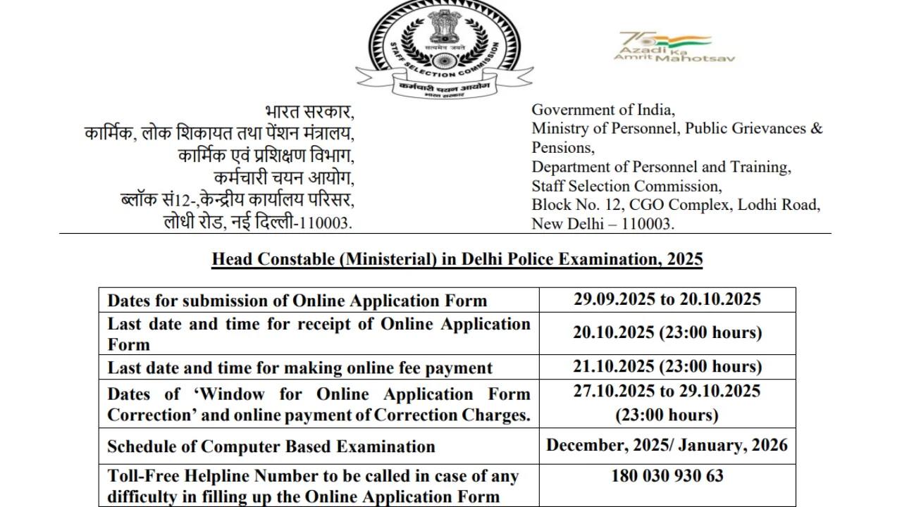 The Staff Selection Commission (SSC) has officially released the Delhi Police Head Constable (Ministerial) 2025 notification inviting eligible candidates to apply online for a total of 509 vacancies. This post provides a detailed guide including eligibility, exam pattern, selection process, salary, and application process.