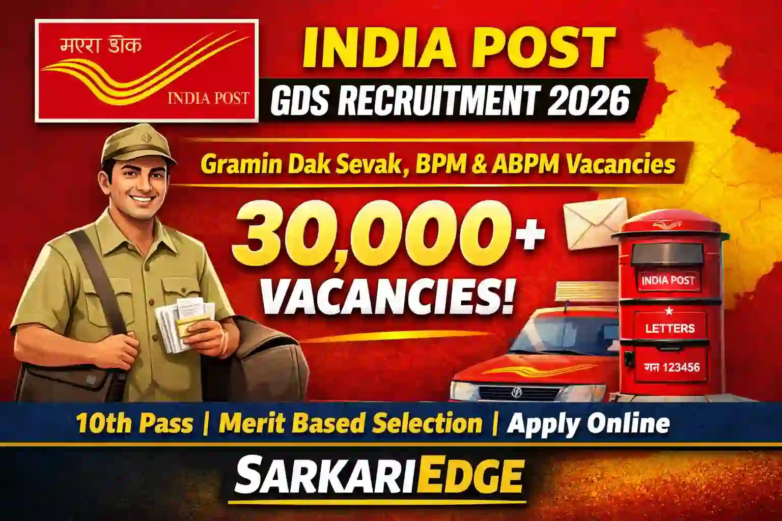 Short Information: India Post is expected to release the India Post GDS Recruitment 2026 notification for more than 30000 vacancies of Gramin Dak Sevak (GDS), Branch Postmaster (BPM) and Assistant Branch Postmaster (ABPM) across different postal circles in India. This recruitment provides an excellent opportunity for candidates seeking a government job after Class 10. The selection process is simple and transparent, as it is based purely on merit without any written examination.