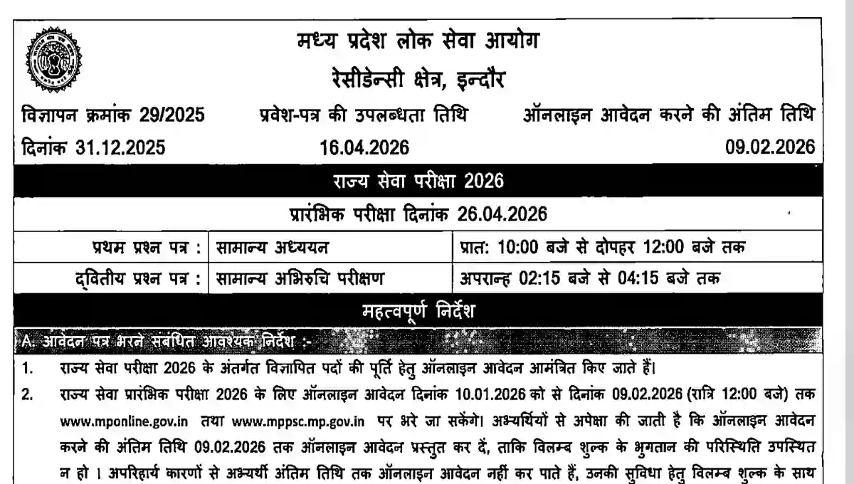 | The MPPSC State Service & State Forest Service Preliminary Examination 2026 will be held on 26 April 2026 (Sunday). |