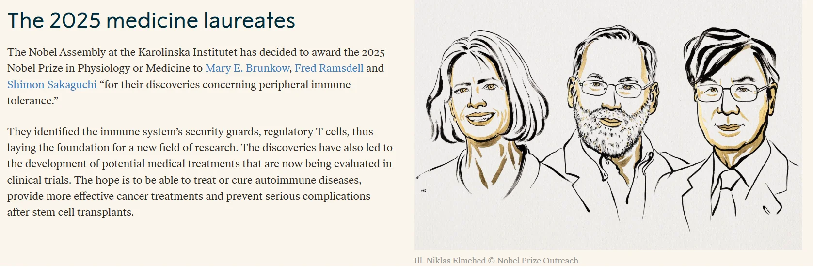 6th October 2025 | Physiology or Medicine | Mary E. Brunkow (USA) Fred Ramsdell (USA) Shimon Sakaguchi (Japan) | Awarded for their discovery of regulatory T cells and the pivotal role of the Foxp3 gene in controlling the immune system. More Details |
