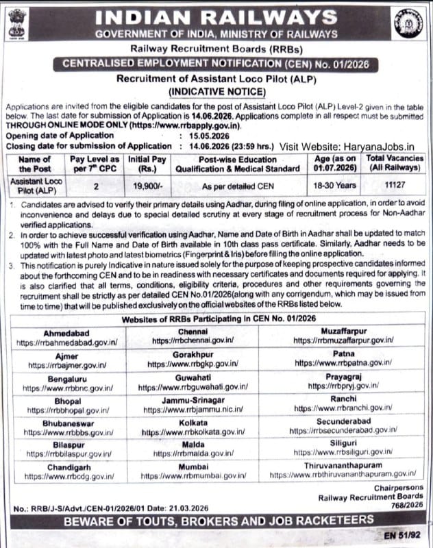 Recruitment of Assistant Loco Pilot (ALP) – CEN No. 01/2026