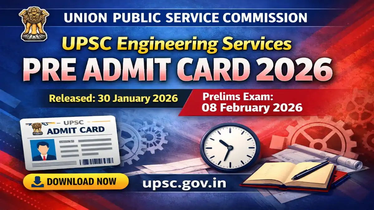 The Union Public Service Commission (UPSC) has released the Engineering Services (Preliminary) Examination 2026 Admit Card on 30 January 2026. Candidates who applied for the UPSC Engineering Services Examination (ESE/IES) 2026 can now download their e-Pre Admit Card from the official website. The UPSC ESE Preliminary Examination will be conducted on 08 February 2026 in offline mode.